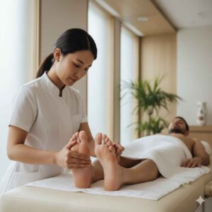 - Massagem nos pés: foca em relaxamento local e alívio da fadiga, sem seguir pontos reflexos definidos.
